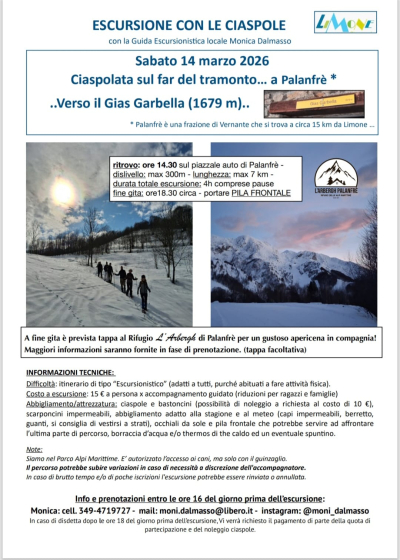 Sabato 14 marzo ciaspolata guidata al tramonto da Palanfré (Vernante) verso il Gias Garbella (1679 m) per ammirare i colori del tramonto che infiammano le cime innevate. Ritrovo alle 14.30 sul piazzale auto di Palanfrè, rientro verso le 18.30 circa. Prenotazione obbligatoria.