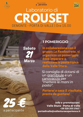 Sabato 21 marzo, dalle ore 15 presso la Porta di Valle a Demonte, pomeriggio speciale dedicato ai Crouset, la pasta tipica della Valle Stura. Sotto la guida delle mastre pastaie di Vinadio, si scopriranno segreti, gesti antichi e tradizioni che si tramandano da generazioni. Laboratorio su prenotazione, a pagamento.