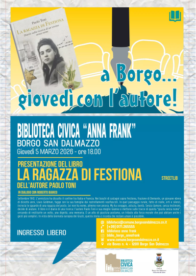 Giovedì 5 marzo 2026, alle ore 18.00, nell'ambito della rassegna "A Borgo... giovedì con l'autore", la Biblioteca Civica Anna Frank ospita la presentazione del libro La ragazza di Festiona (StreetLib), sintesi della ricerca condotta dal prof. Paolo Toni. Ingresso libero.