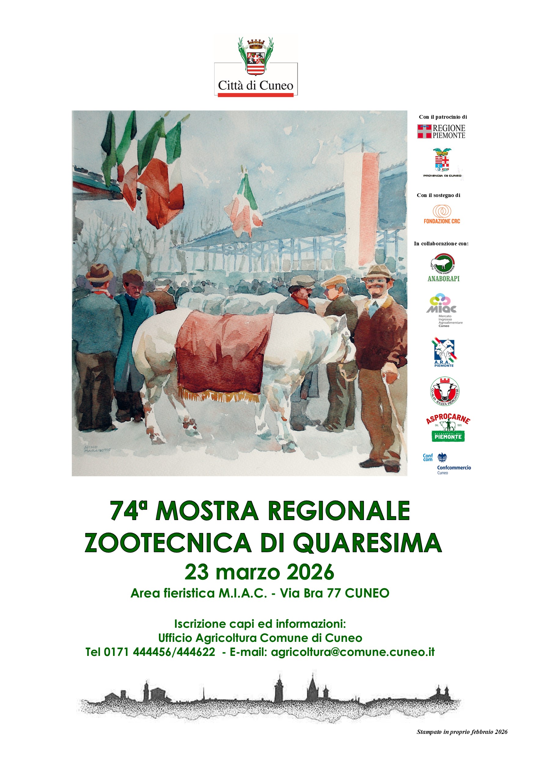 Lunedì 23 marzo 2026 presso l'Area Fieristica M.I.A.C. (in Via Bra n. 77 Località Ronchi – Cuneo) si terrà la “74ª Mostra Regionale Zootecnica di Quaresima”, tradizionale rassegna riservata ai bovini da macello di razza “Piemontese” e a di altre razze.