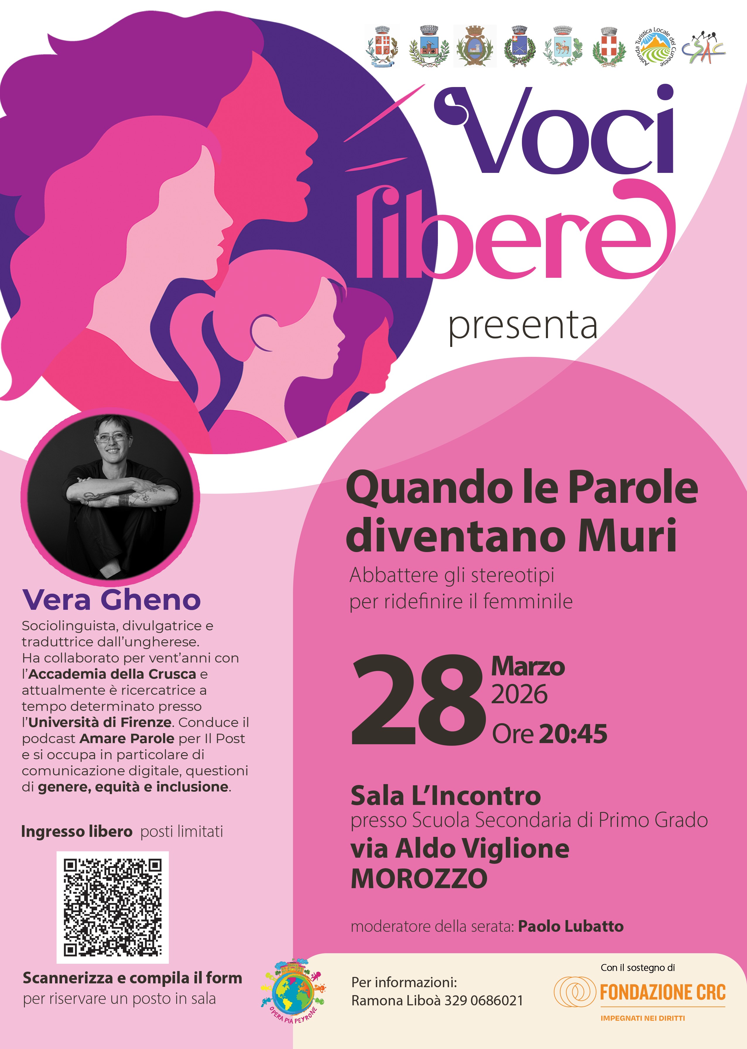 Non perderti l' appuntamento con Vera Gheno a Morozzo sabato 28 marzo alle ore 20.45 presso la Sala l'Incontro. Una serata dedicata all'abbattimento degli stereotipi per ridefinire il femminile attraverso la forza del linguaggio. Prenota il tuo posto