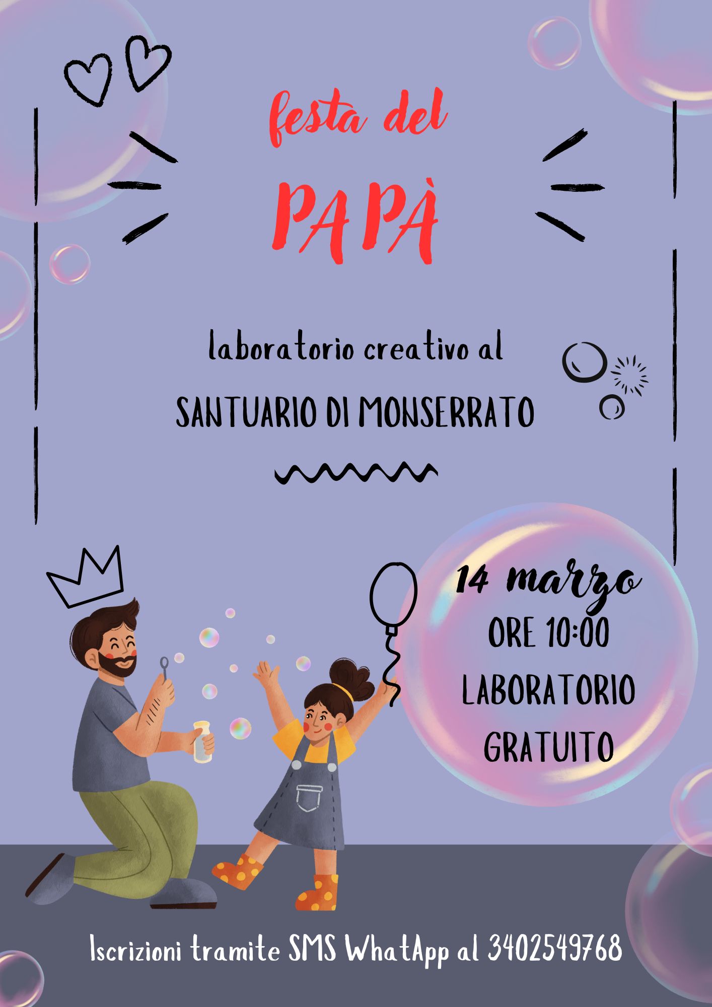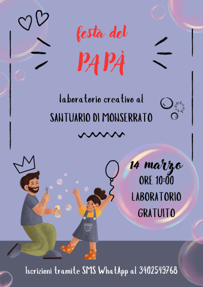 In occasione della Festa del Papà, i volontari dell’Associazione Monserrato ODV organizzano una mattinata speciale dedicata a bambini e famiglie. Sabato 14 marzo, a partire dalle ore 10, presso il suggestivo Santuario di Monserrato, si terrà un laboratorio creativo pensato per celebrare i papà .