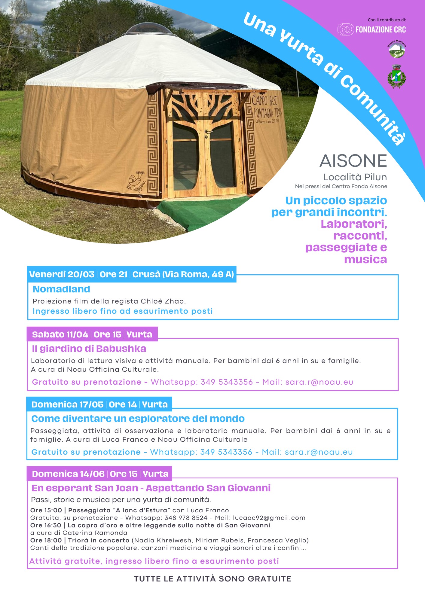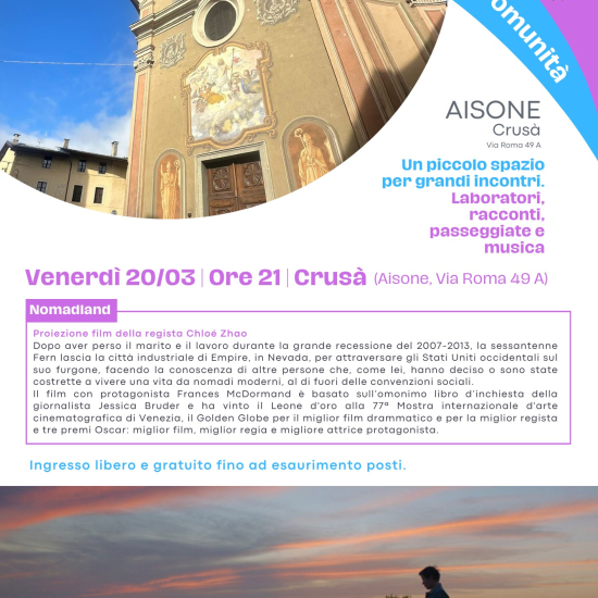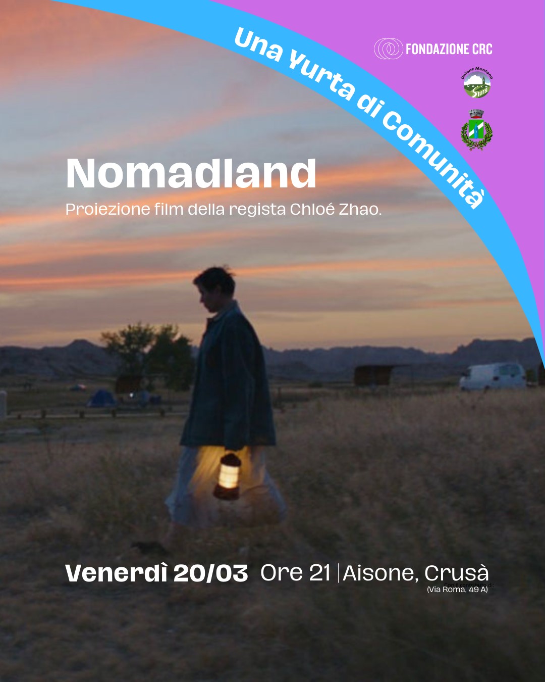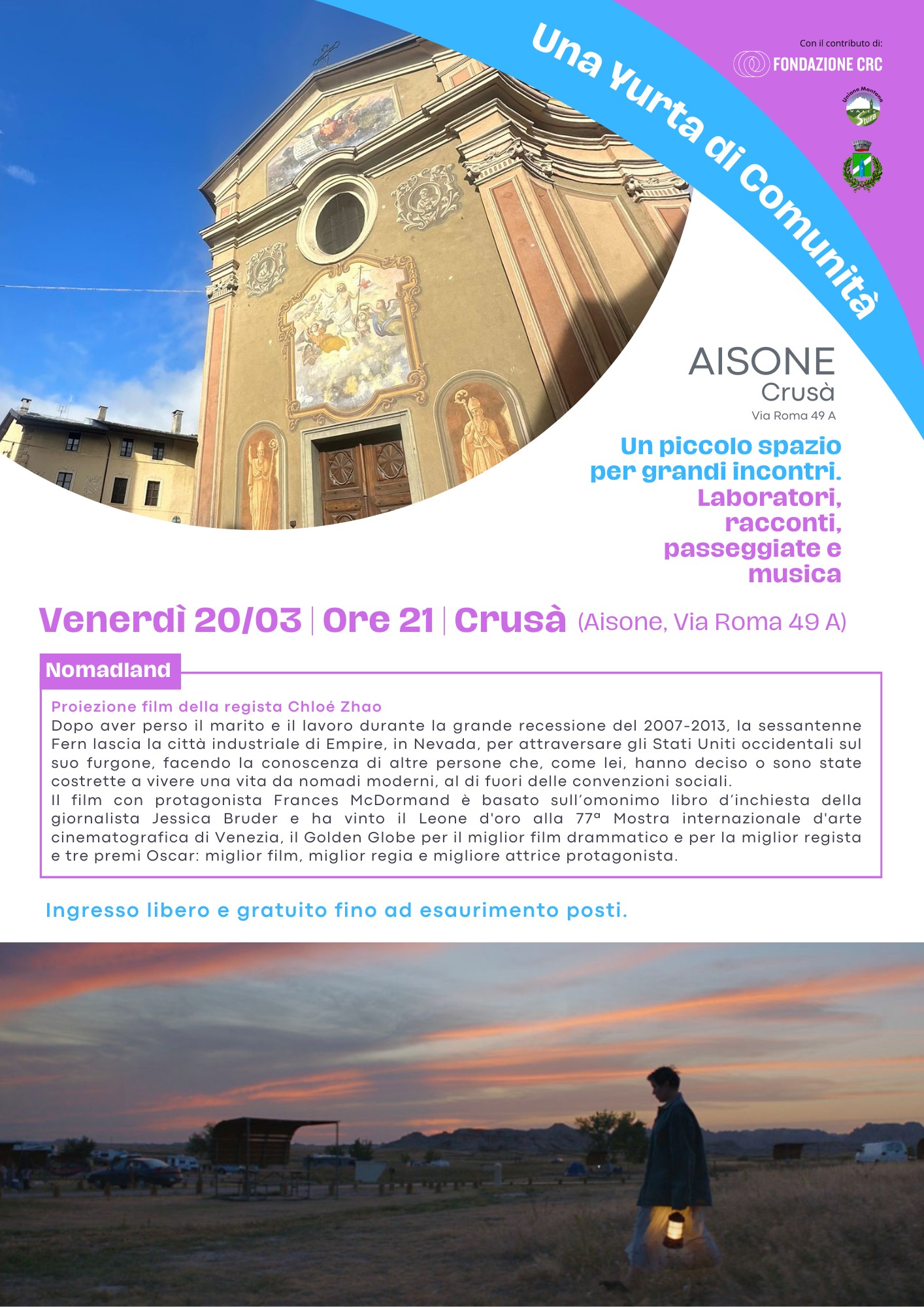 Venerdì 20 marzo, alle ore 21 presso la Crusà di Aisone proiezione del film Nomadland della regista Chloé Zhao. L'evento si inserisce nella rassegna "Una Yurta di comunità" dell'Unione Montana Valle Stura e del Comune di Aisone, finanziato da Fondazione CRC. Ingresso libero, fino a esaurimento posti.