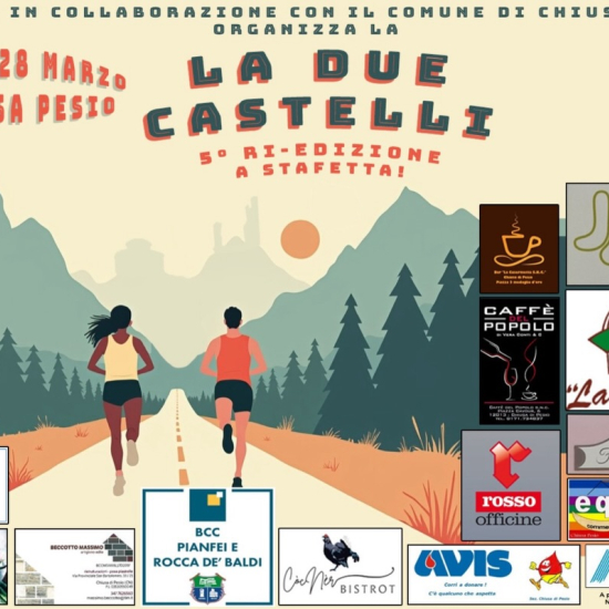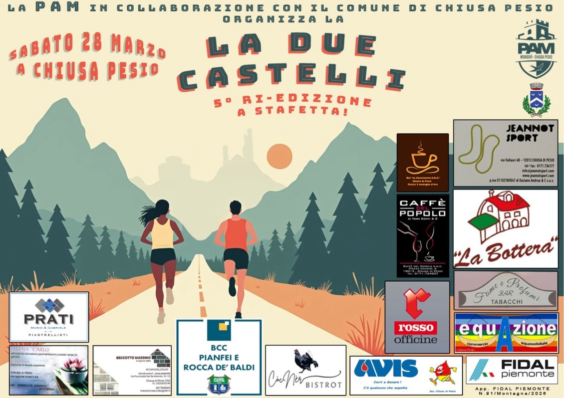Sabato 28 marzo torna l’atteso appuntamento con la “Due Castelli”, manifestazione podistica organizzata dalla Società P.A.M. Mondovì-Chiusa di Pesio, in collaborazione con il Comune di Chiusa di Pesio. Atleti e appassionati si ritroveranno per una giornata all’insegna dello sport e della valorizzazione del territorio, lungo un percorso che unisce due dei luoghi più suggestivi del paese: il Castello Mirabello e la Residenza di Caccia di Mombrisone.