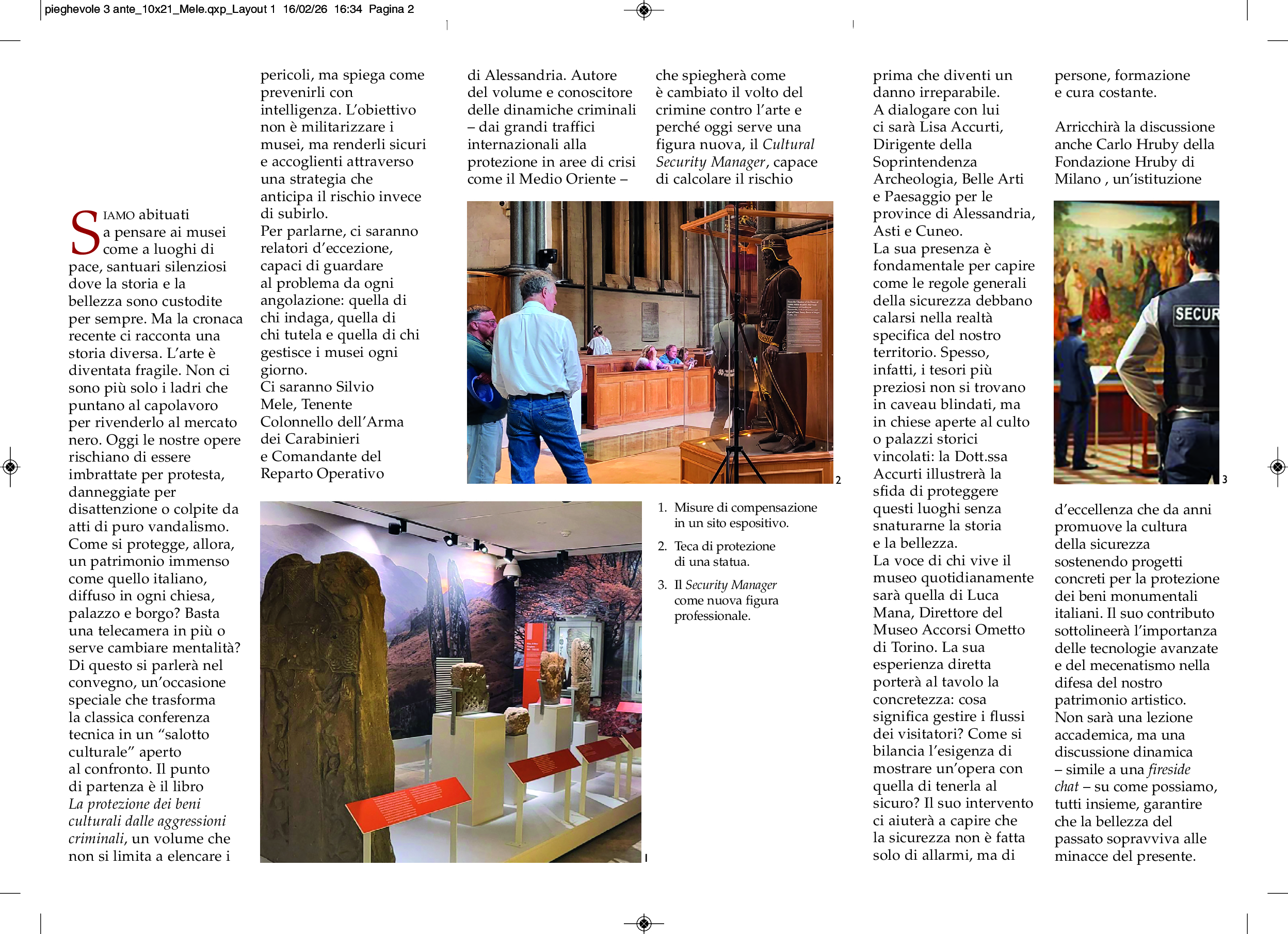 Venerdì 27 marzo alle ore 17.30, presso la Sala Barbero del Castello degli Acaia a Fossano, "Cultura sotto attacco: dal furto del Louvre alle minacce del presente". Convegno dedicato alla protezione del patrimonio artistico italiano. Relatore Silvio Mele, Comandante del Reparto Operativo dei Carabinieri di Alessandria. Partecipano Lisa Accurti (Sopraintendenza Archeologia Belle Arti), Carlo Hruby (Fondazione Hruby Milano) e Luca Mana (Direttore Museo Accorsi Ometto Milano). Ingresso gratuito.