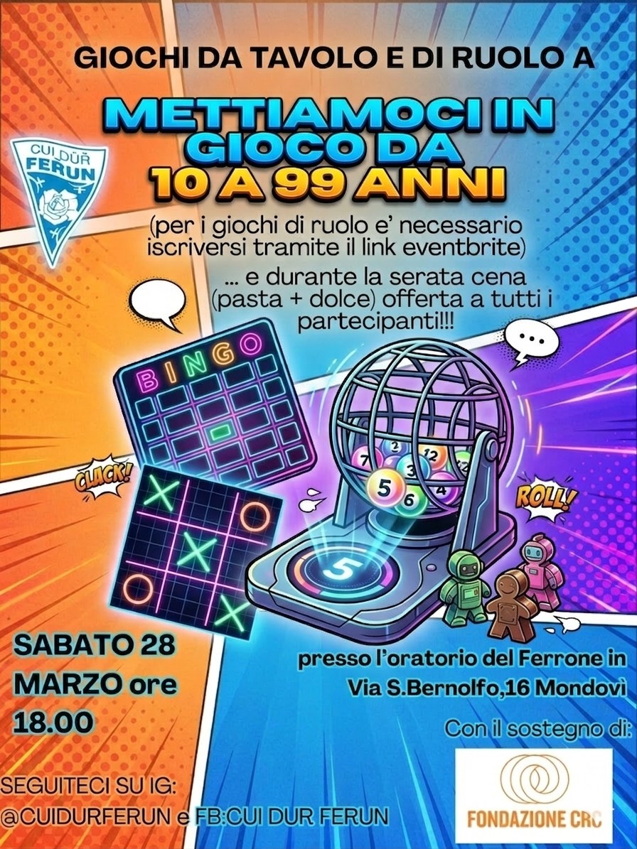 Un nuovo appuntamento di “Mettiamoci in gioco” è in arrivo sabato 28 marzo 2026 a partire dalle ore 18 presso i locali dell’oratorio della Parrocchia di Santa Maria Maggiore a Mondovì. Sarà possibile prendere parte ai tavoli dei giochi di ruolo (iscrizione obbligatoria qui) e/o cimentarsi in giochi da tavolo (per i quali non è necessaria la prenotazione).