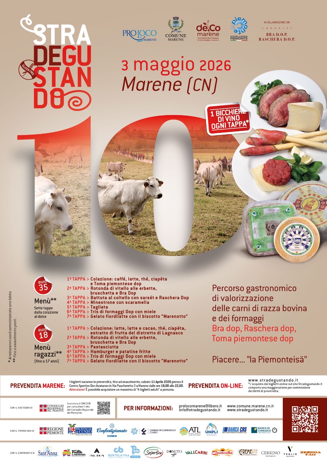 Domenica 3 maggio, a Marene torna Stradegustando, la passeggiata enogastronomica organizzata dalla pro loco. Il menù adulti avrà un costo di 35 euro, il menù bambini di 18 euro. Da sabato 11 aprile saranno disponibili le prevendite presso il Centro Sportivo Don Avataneo.