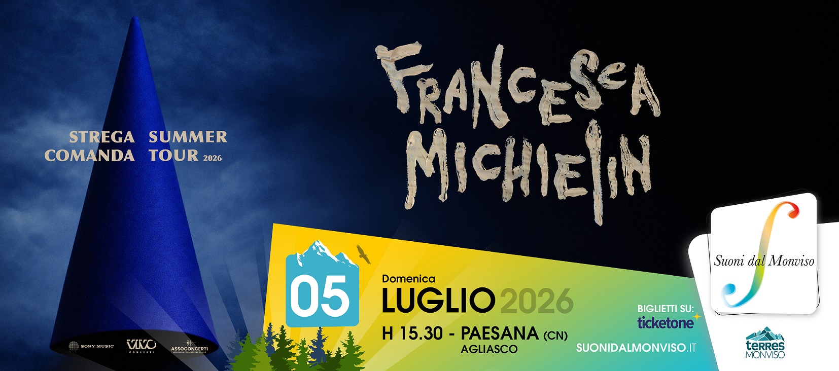 Domenica 5 luglio alle ore 15.30 Francesca Michielin sarà la protagonista di un concerto unico, nella bellissima cornice di Agliasco a Paesana, ai piedi del Monviso. Dopo aver solcato i più prestigiosi palchi d'Europa con la sua eleganza e il suo talento è pronta a meravigliare anche il nostro territorio in una data unica! Seguiranno aggiornamenti per le modalità di accesso all'area.