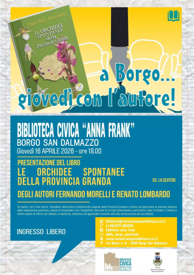 Giovedì 16 aprile 2026, alle ore 18.00, la Biblioteca Civica “Anna Frank” di Borgo San Dalmazzo ospita un nuovo appuntamento della rassegna “A Borgo… giovedì con l’autore!”. Sarà presentato il volume “Le orchidee spontanee della Provincia Granda”, di Fernando Morelli e Renato Lombardo. Ingresso libero.