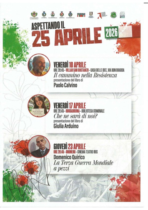 In Valle Maira una serie di incontri culturali dedicati alla Festa della Liberazione, alla memoria storica, alla riflessione sul presente e al valore della Resistenza. Venerdì 10 aprile alle ore 20.45 alla Casa delle Idee di Villar San Costanzo, "Il cammino nella Resistenza", presentazione del libro di Paolo Calvino. Venerdì 17 aprile alle ore 20.45 la biblioteca Comunale di Roccabruna ospita la presentazione del libro di Giulia Arduino "Che ne sarà di noi?" Giovedì 23 aprile alle ore 20.45 al Teatro Iris di Dronero incontro con Domenico Quirico dal titolo "La Terza Guerra Mondiale a pezzi".