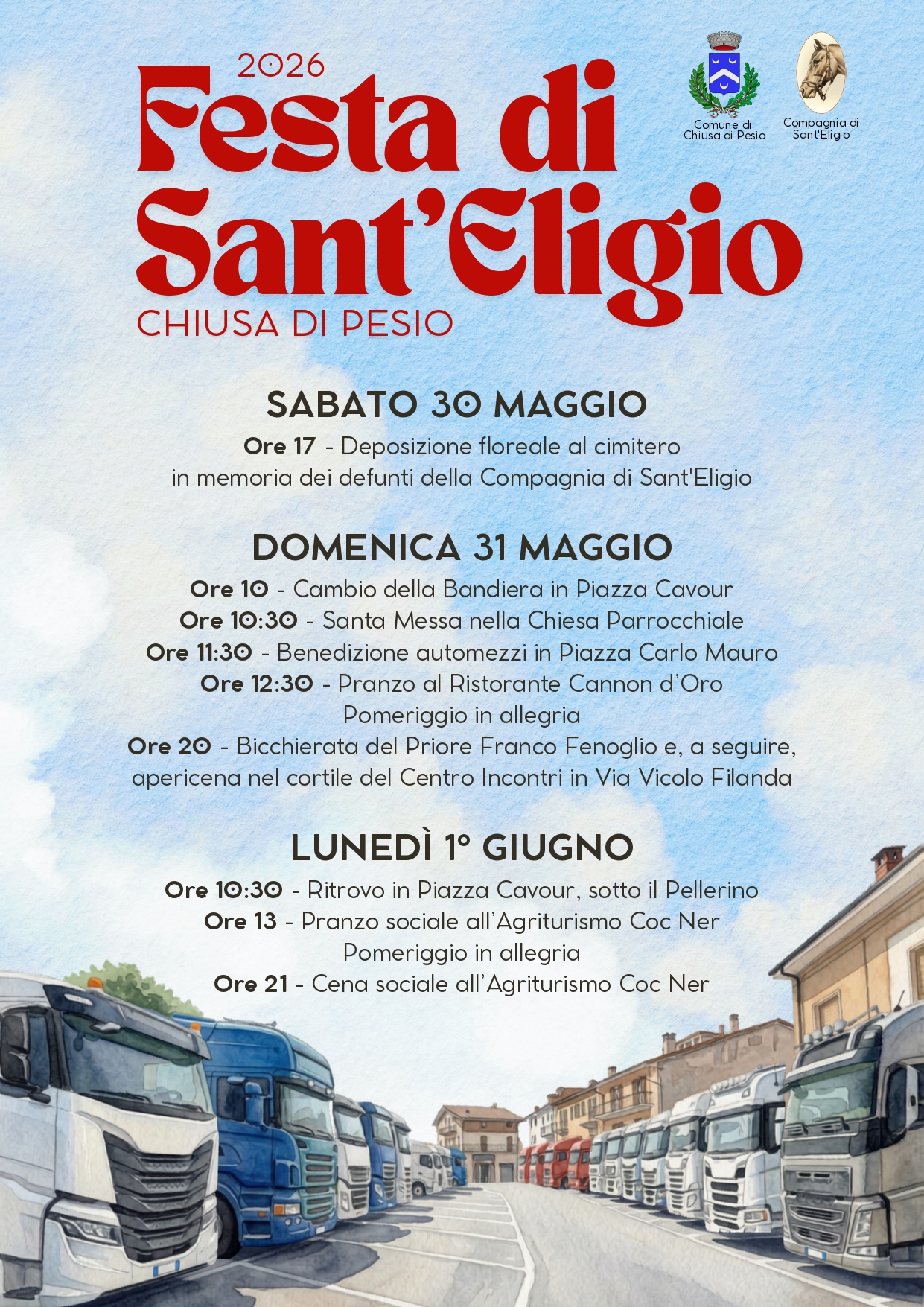 Sabato 30, domenica 31 maggio e lunedì 1° giugno a Chiusa di Pesio si festeggia Sant'Eligio, santo patrono di maniscalchi, camionisti e carrettieri.