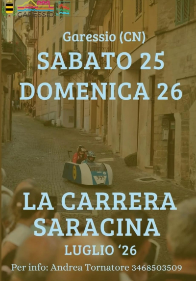 Torna a Garessio l’adrenalinica Carrera Saracina, la tradizionale corsa con carretti artigianali lungo le vie del paese. Appuntamento sabato 25 e domenica 26 luglio per prove e gara. Competizione e spettacolo assicurati!