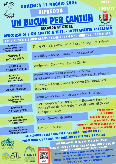 Domenica 17 maggio a Rifreddo si svolge la seconda edizione di “Un Bucun per Cantun”, camminata enogastronomica di circa 7 km lungo un percorso interamente asfaltato e adatto a tutti, con partenza e arrivo al campo sportivo parrocchiale. Partenze ogni 20 minuti dalle 11 alle 14. Prenotazione obbligatoria entro il 13 maggio ai contatti riportati di seguito.